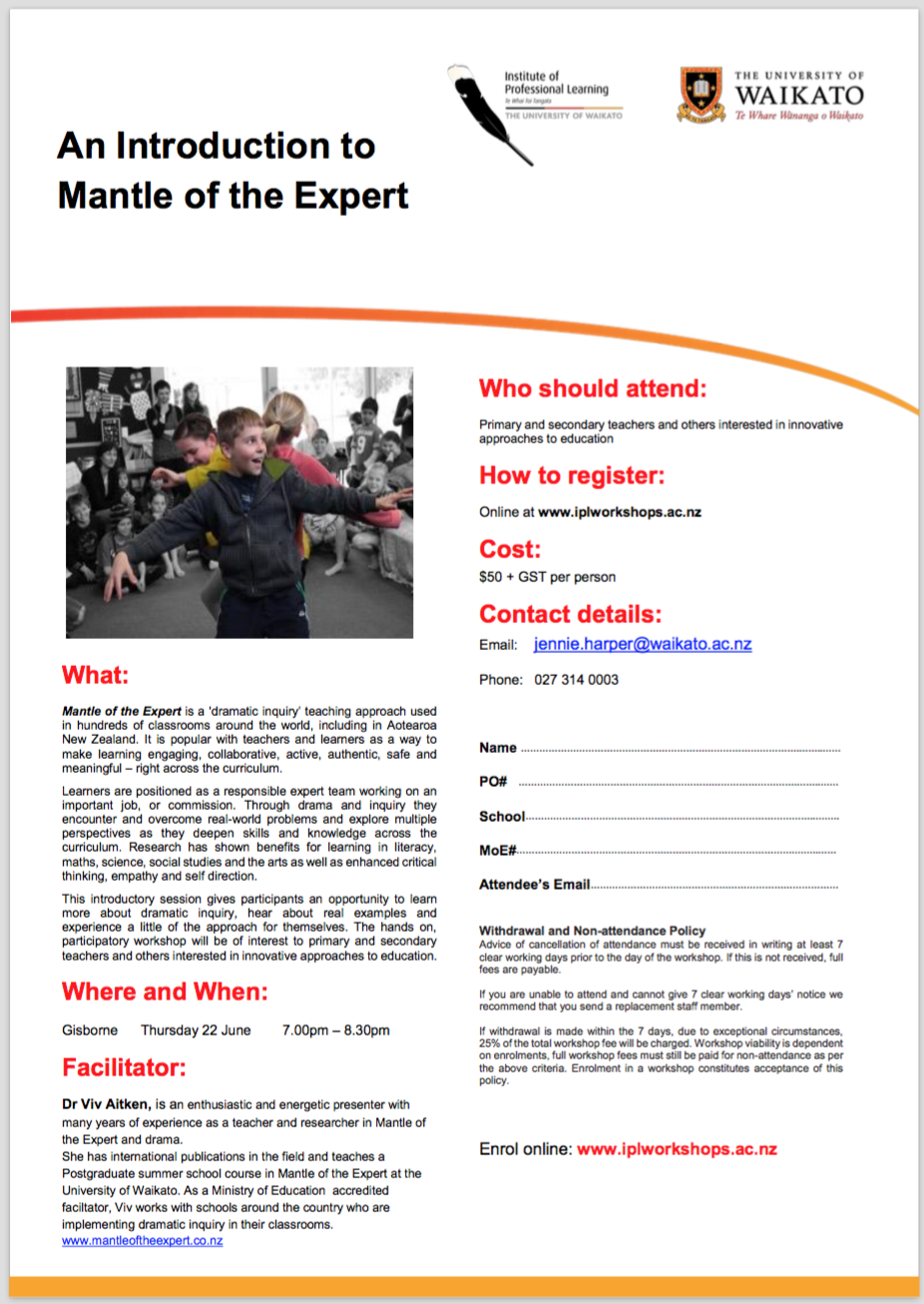 The Institute of Professional Learning at the University of Waikato is hosting an Introduction to Mantle of the Expert session in Gisborne on Thursday 22nd June. Details are on the attached flier.